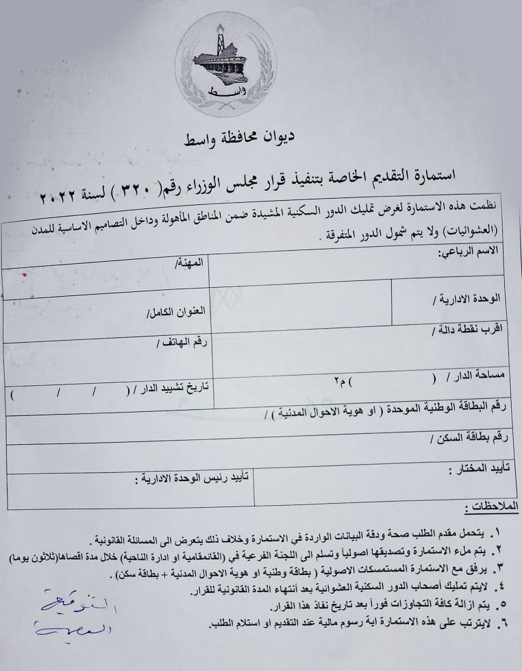 استمارة التقديم الخاصة بتنفيذ قرار مجلس الوزراء لتمليك الدور السكنية الزراعية صادرة عن ديوان محافظة واسط .